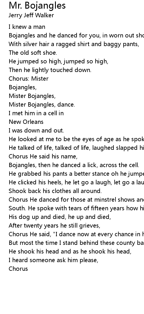 Chorus He said, "I dance now at every chance in honky tonks for drinks and tips. But most the time I stand behind these county bars cause I drinks a bit." |