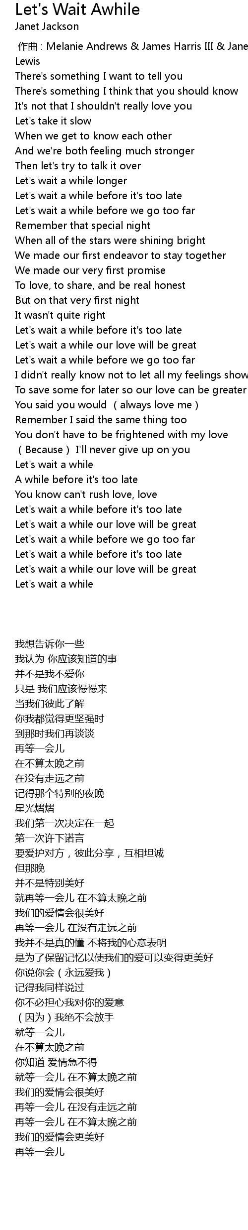 | [00:55.67] | Let' s wait a while before it' s too late |