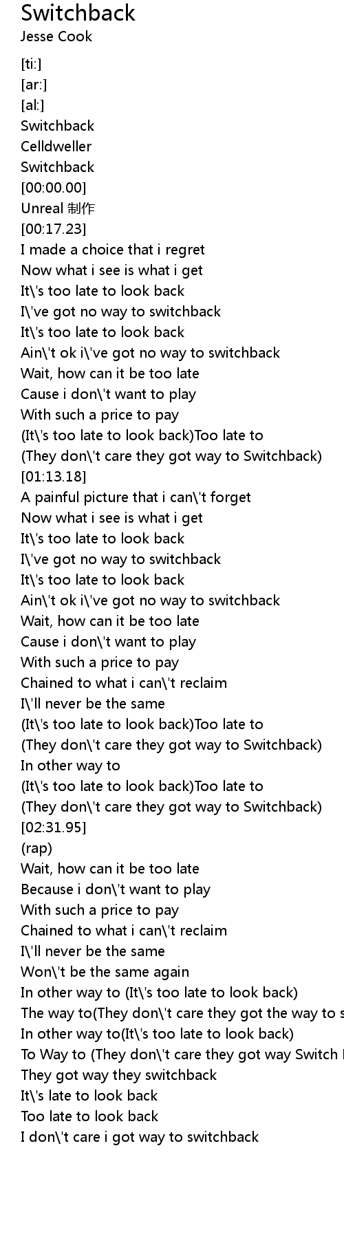 | [00:41.11] | Ain' t ok i' ve got no way to switchback |