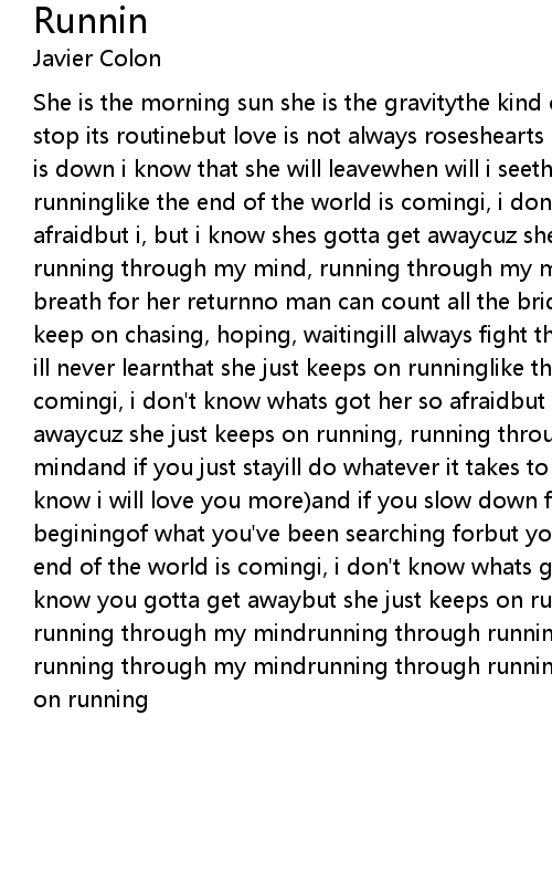 She is the morning sun she is the gravitythe kind of girl that makes the world stop its routinebut love is not always roseshearts get brokenand when my guard is down i know that she will leavewhen will i seethat she just keeps on runninglike the end of the world is comingi, i don't know whats got her so afraidbut i, but i know shes gotta get awaycuz she just keeps on running, running through my mind, running through my mindagain she left wont hold my breath for her returnno man can count all the bridges that shes burnedbut i just keep on chasing, hoping, waitingill always fight this war cuz lovers never learn ill never learnthat she just keeps on runninglike the end of the world is comingi, i don't know whats got her so afraidbut i, but i know shes gotta get awaycuz she just keeps on running, running through my mind, running through my mindand if you just stayill do whatever it takes to love you more ( don't you know i will love you more)and if you slow down for a minutethis could be the beginingof what you've been searching forbut you just keep on runninglike the end of the world is comingi, i don't know whats got you so afraidbut i, but i know you gotta get awaybut she just keeps on running, running through my mind, running through my mindrunning through running through my mindrunning through running through my mindrunning through running through my mindbut you just keep on running |