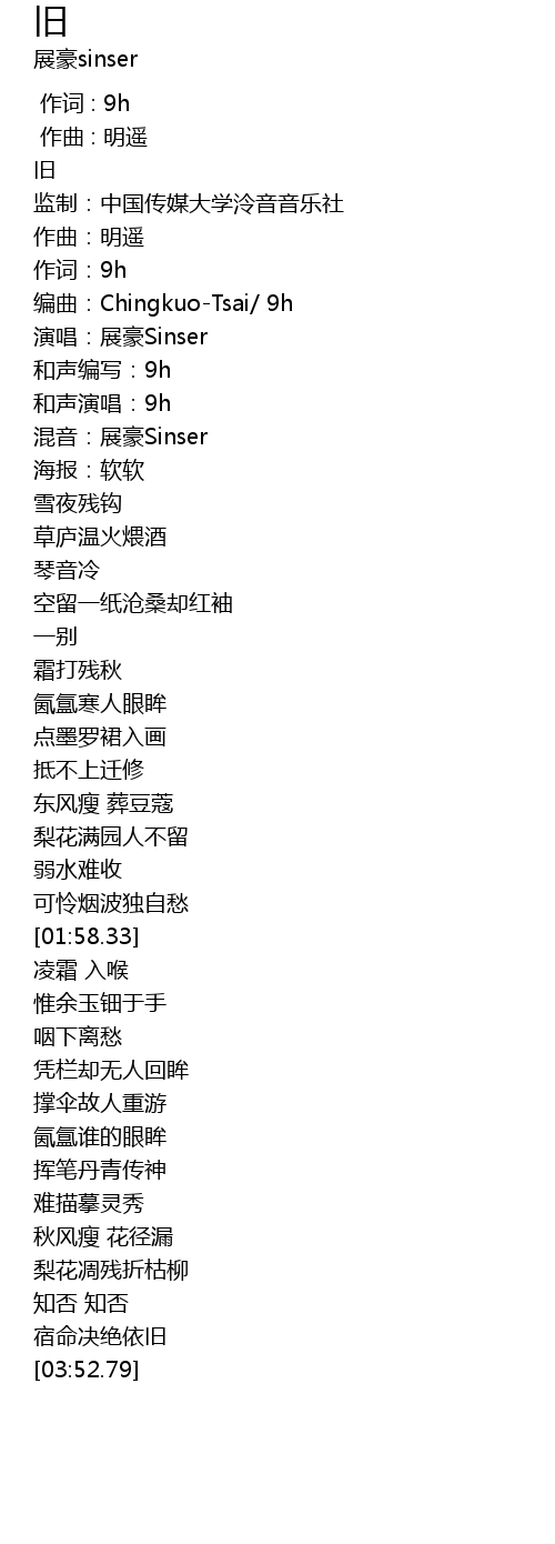 | [00:21.52] | 编曲:Chingkuo-Tsai/ 9h |