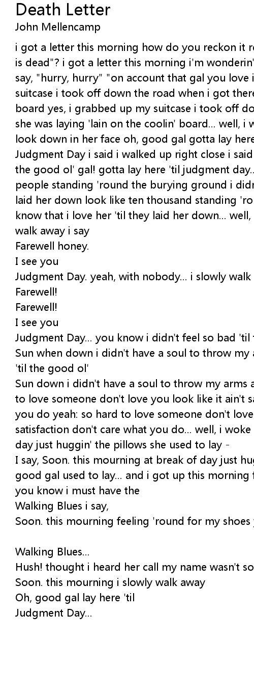 i got a letter this morning how do you reckon it read? "hurry the gal you love is dead"? i got a letter this morning i'm wonderin' how you reckon it read he say, "hurry, hurry" "on account that gal you love is dead" i grabbed up my suitcase i took off down the road when i got there she was laying on the coolin' board yes, i grabbed up my suitcase i took off down the road when i got there she was laying 'lain on the coolin' board... well, i walked up right close i look down in her face oh, good gal gotta lay here 'til |
