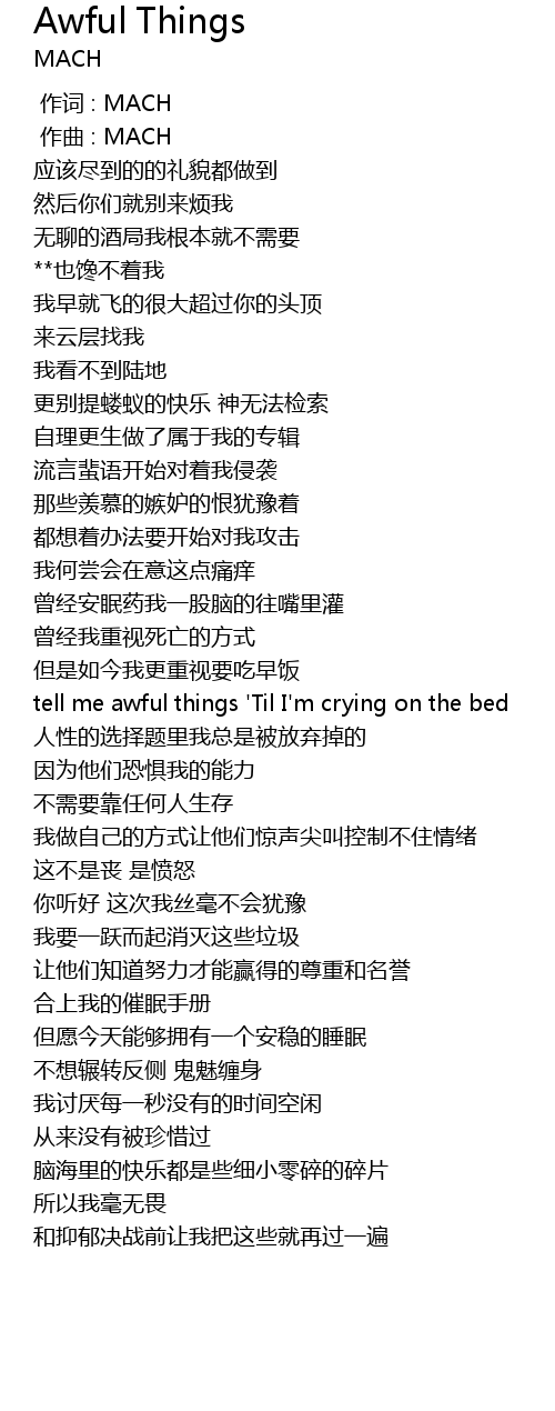 | [01:07.732] | tell me awful things ' Til I' m crying on the bed |