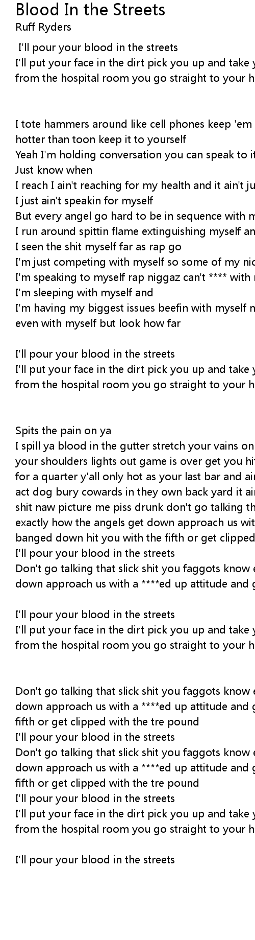 I spill ya blood in the gutter stretch your vains on the corner put your face in your shoulders lights out game is over get you hit for five cent who got change for a quarter y'all only hot as your last bar and ain't half as tough as they act dog bury cowards in they own back yard it ain't a mutha****in thing change shit naw picture me piss drunk don't go talking that slick shit you faggots know exactly how the angels get down approach us with a ****ed up attitude and get banged down hit you with the fifth or get clipped with the tre pound |