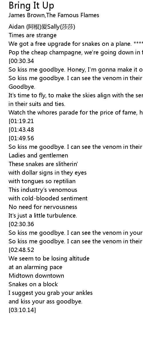 | [01:36.42][01:49.56] | So kiss me goodbye. I can see the venom in their eyes. |