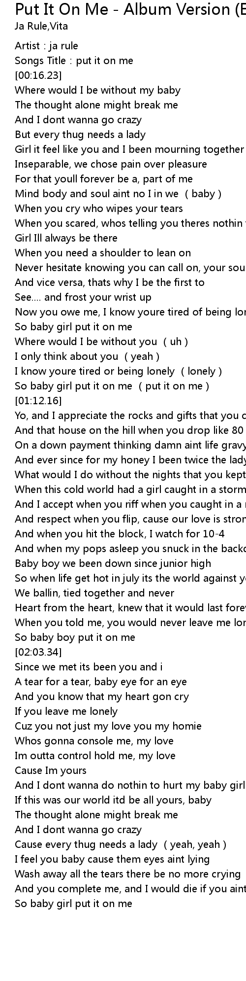| [01:09.35] | So baby girl put it on me (put it on me) |