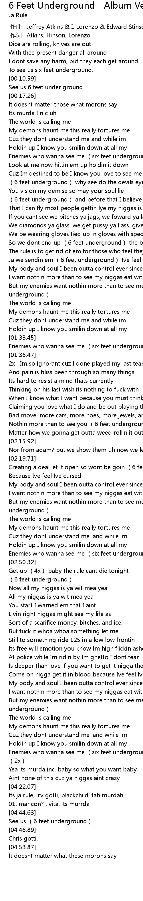 | [02:10.26] | Nothin more than to see you (6 feet underground) doesnt |
