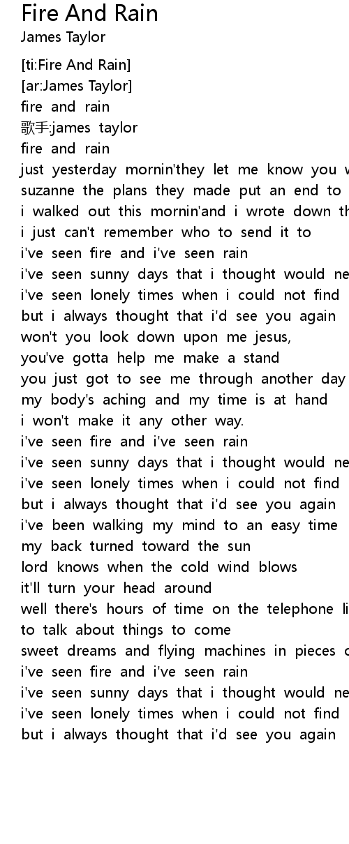| [02:26.586] | i' ve seen fire and i' ve seen rain |
