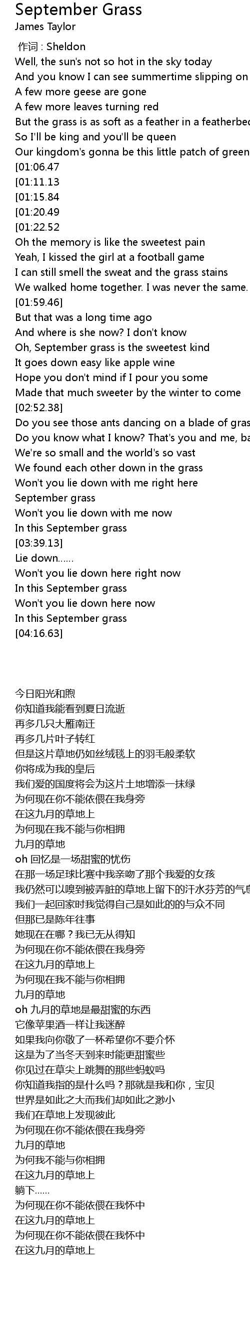 | [02:31.70] | Oh, September grass is the sweetest kind |