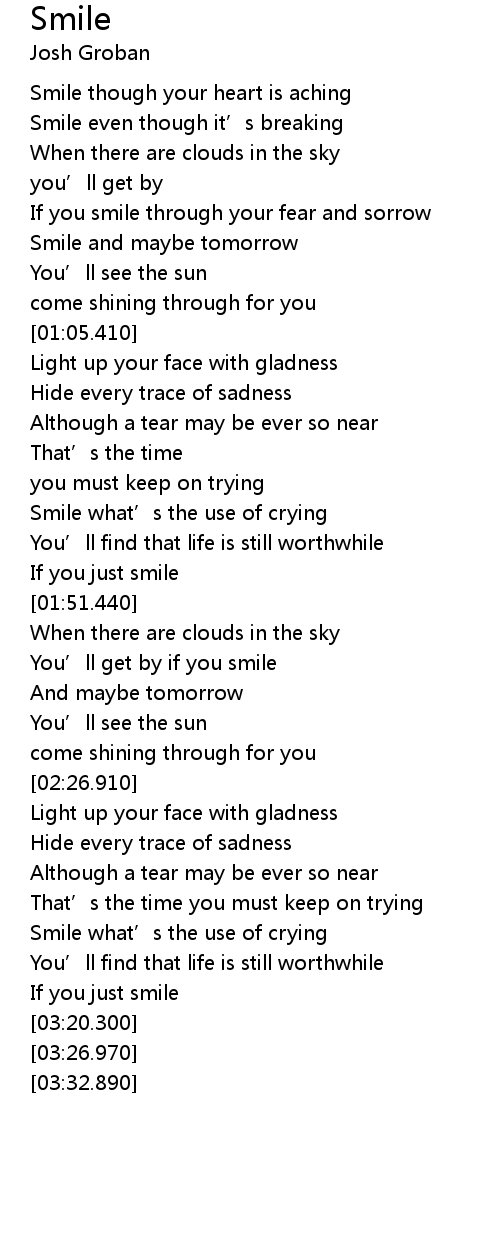 | [00:23.510] | Smile though your heart is aching |