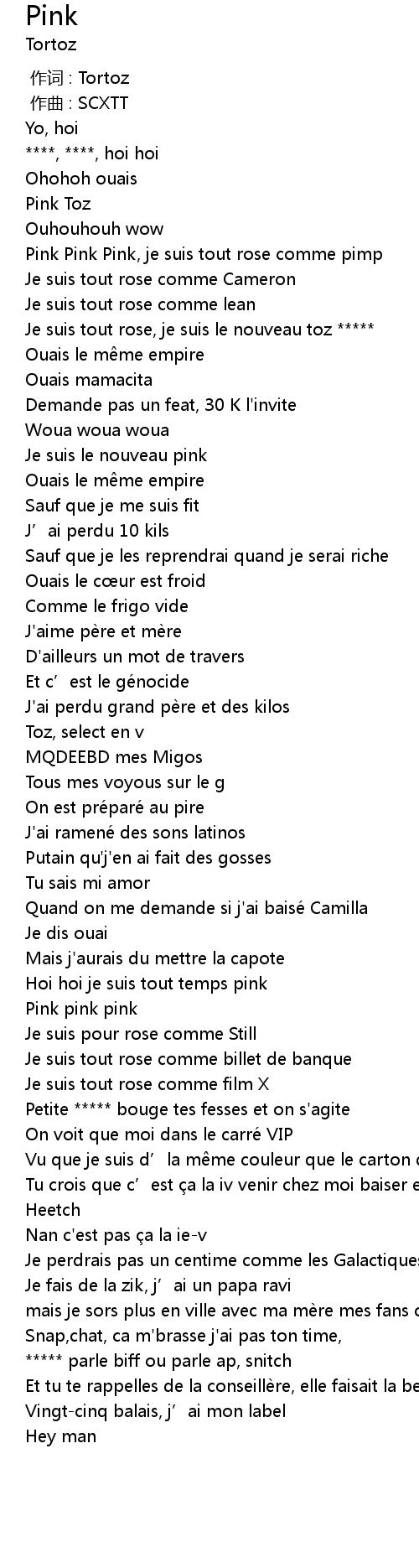 | [00:35.73] | Je suis tout rose, je suis le nouveau toz ***** |