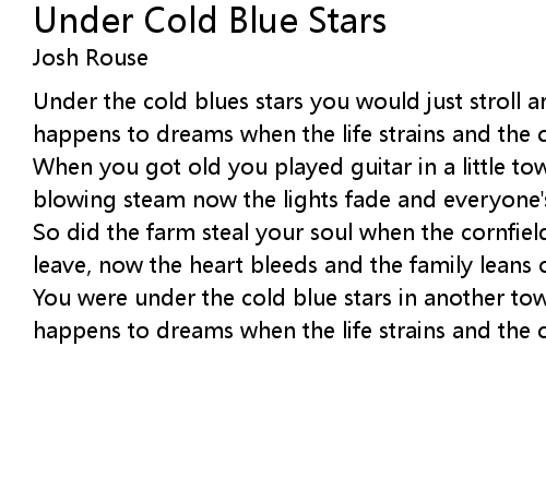 | Under the cold blues stars you would just stroll around the yard that' s what happens to dreams when the life strains and the child lays in you | |