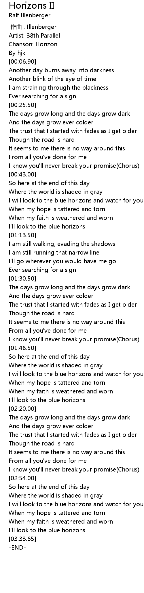 | [01:58.11] | I will look to the blue horizons and watch for you to come |
