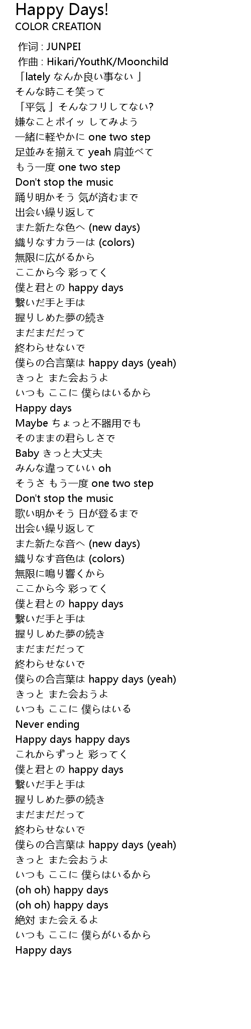 | [03:34.57] | 僕らの合言葉は happy days (yeah) |
