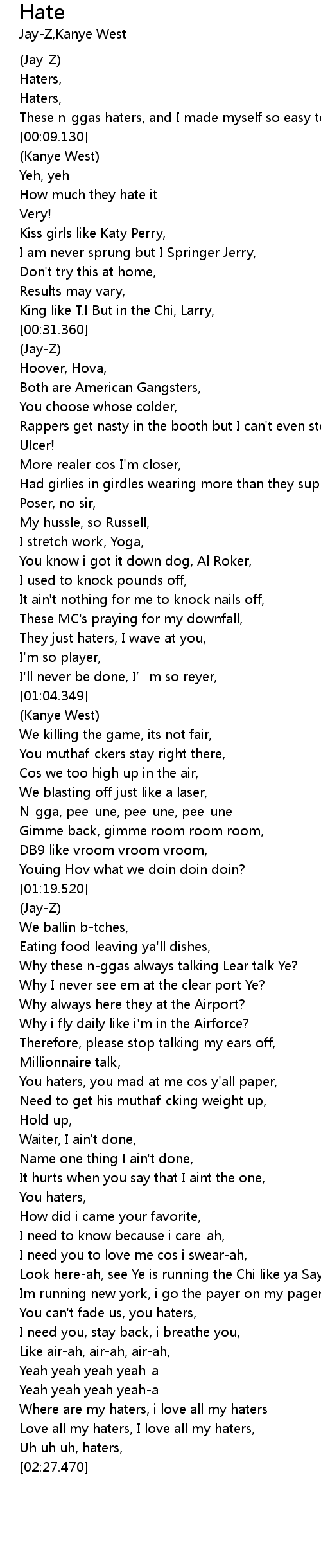 | [02:17.360] | Love all my haters, I love all my haters, |