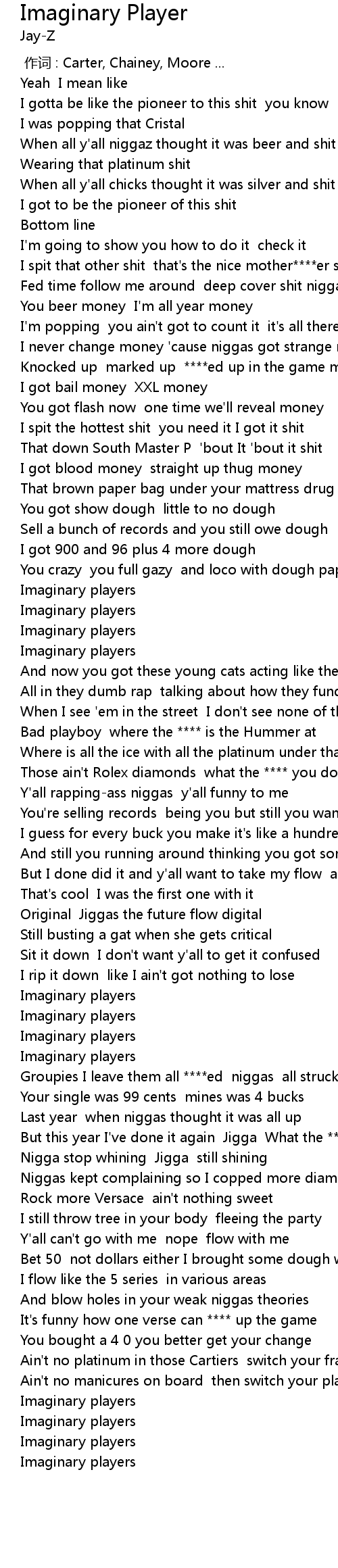 | [00:37.81] | Knocked up marked up ****ed up in the game money |