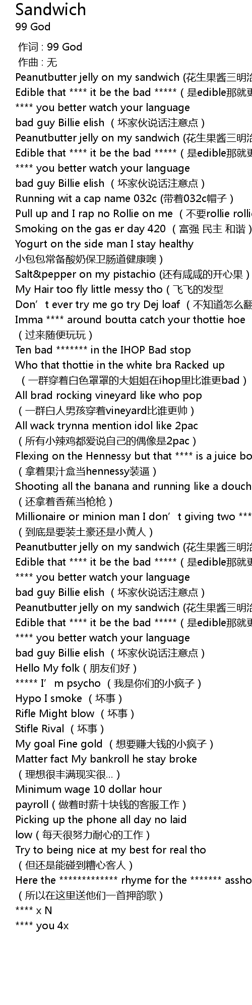 | [01:34.712] | Here the ************* rhyme for the ******* asshole (所以在这里送他们一首押韵歌) |