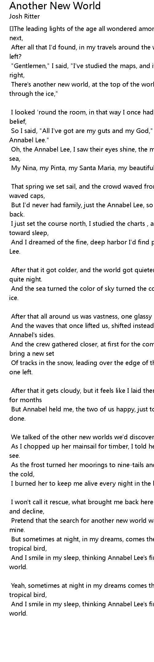 | And I dreamed of the fine, deep harbor I' d find past the ice, for my Annabel Lee. | |