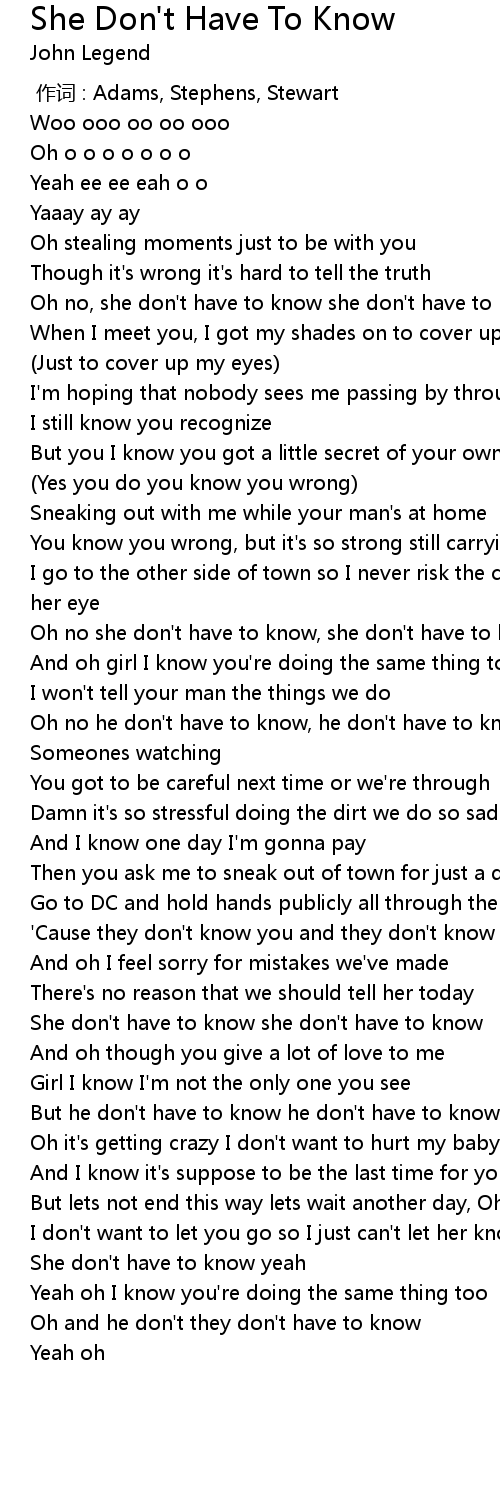 | [00:37.509] | Oh no, she don' t have to know she don' t have to know |