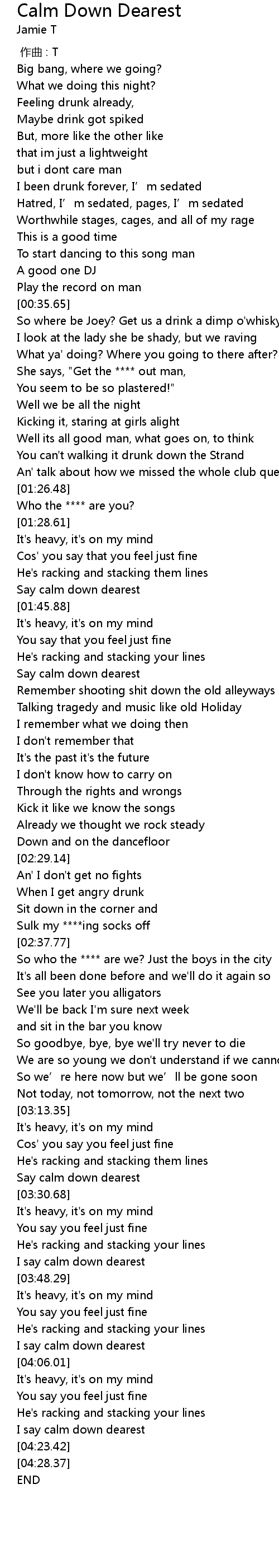 | [02:00.06] | Say calm down dearest |