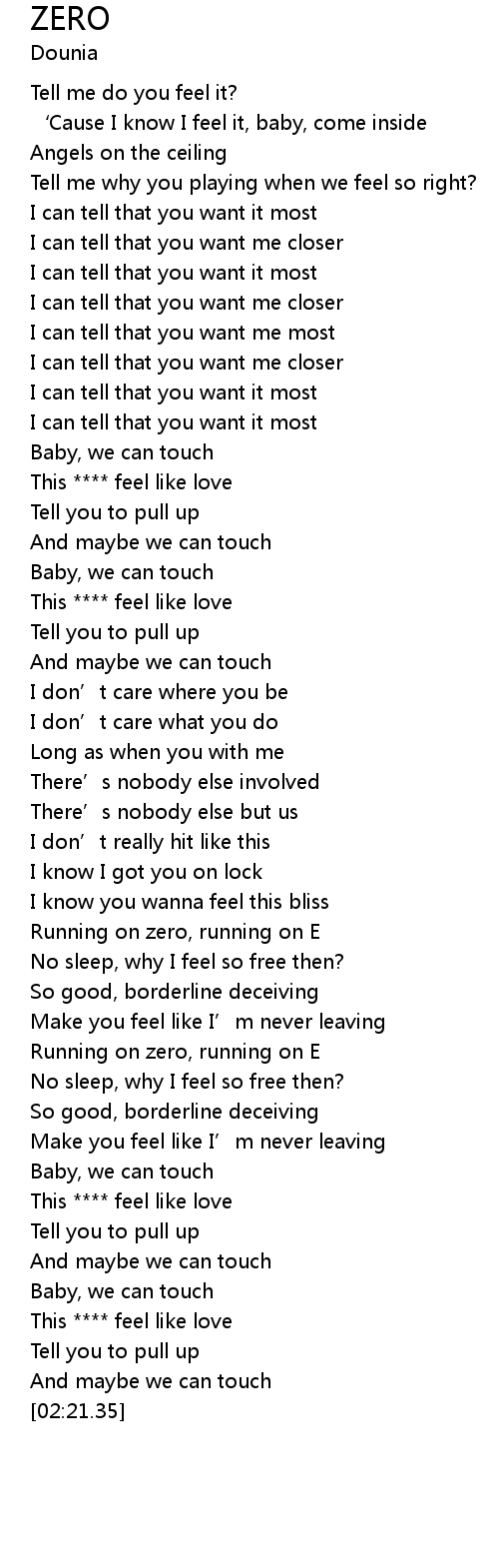 | [00:13.74] | Tell me do you feel it? |