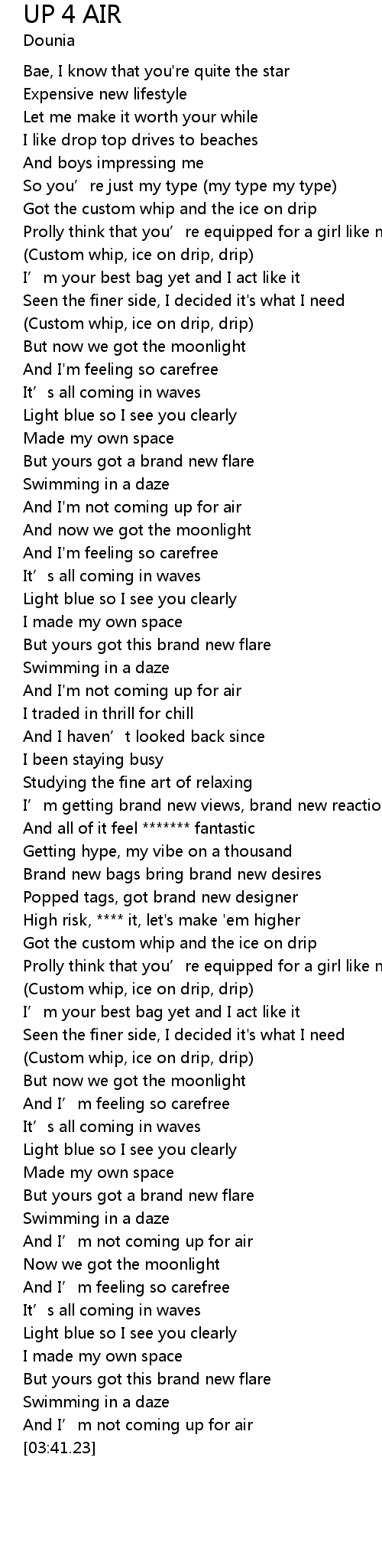 | [01:00.89] | (Custom whip, ice on drip, drip) |