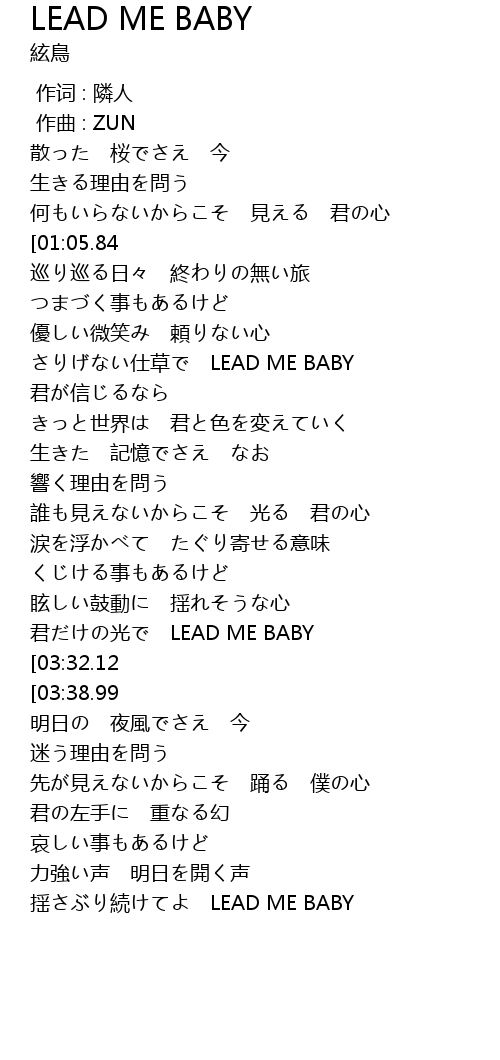 | [02:18.92] | 君だけの光で LEAD ME BABY |