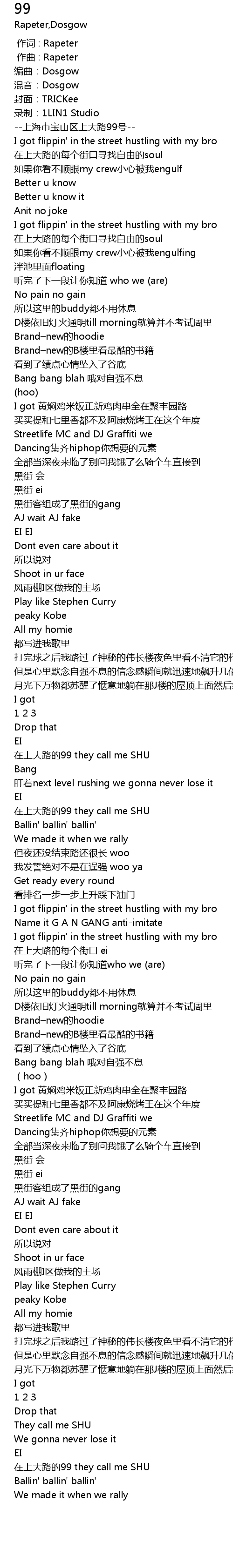 | [01:48.400] | 在上大路的99 they call me SHU |