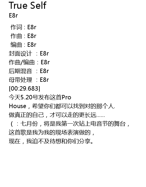 | [00:30.430] | 今天5.20号发布这首Pro House,希望你们都可以找到对的那个人. |