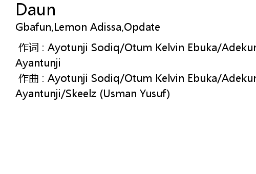 | [00:00.000] | 作曲 : Ayotunji Sodiq/Otum Kelvin Ebuka/Adekunle Marshall Ayantunji/Skeelz (Usman Yusuf) |