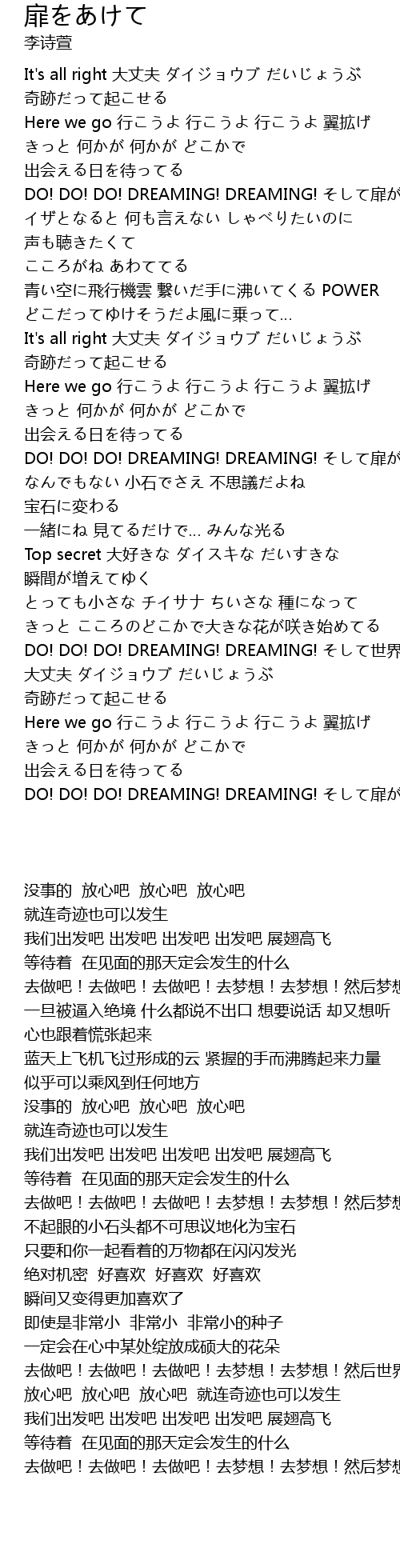 | [00:31.40] | DO! DO! DO! DREAMING! DREAMING! そして扉がひらくよ… |