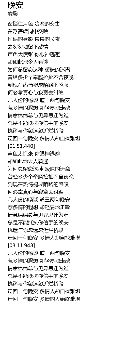 | [03:10.442] | 迂回一句晚安 多情人却自找难堪 |