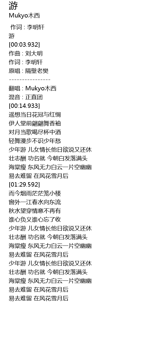 | [00:56.933] | 少年游 儿女情长他日欲说又还休 |