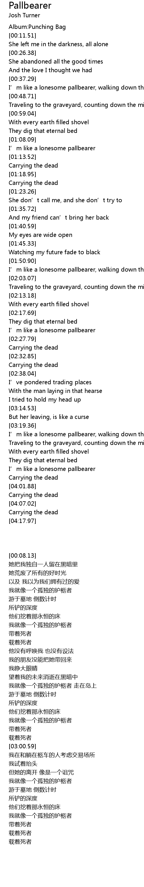 | [03:52.19] | I’m like a lonesome pallbearer |