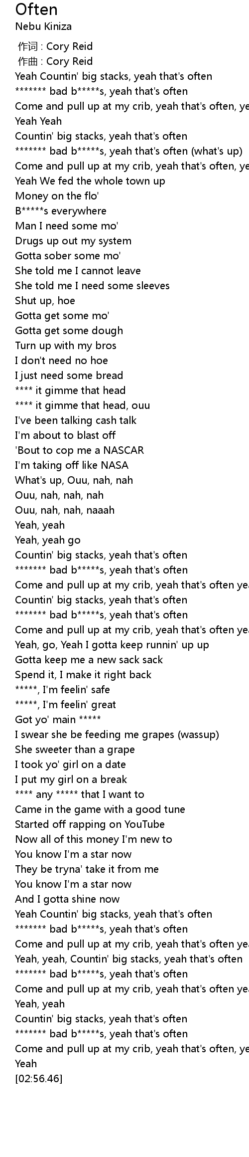 | [02:20.58] | Yeah Countin' big stacks, yeah that's often |