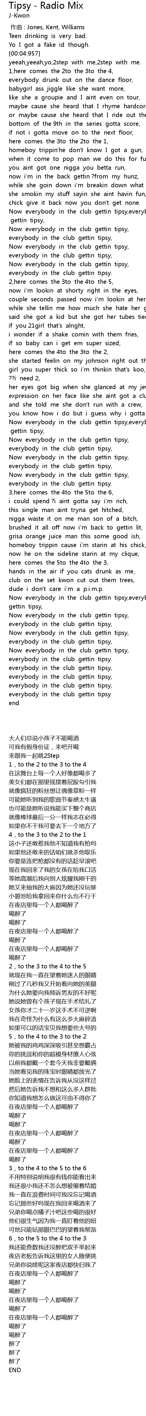 | [00:57.547] | Now everybody in the club gettin tipsy,everybody in the club gettin tipsy, |