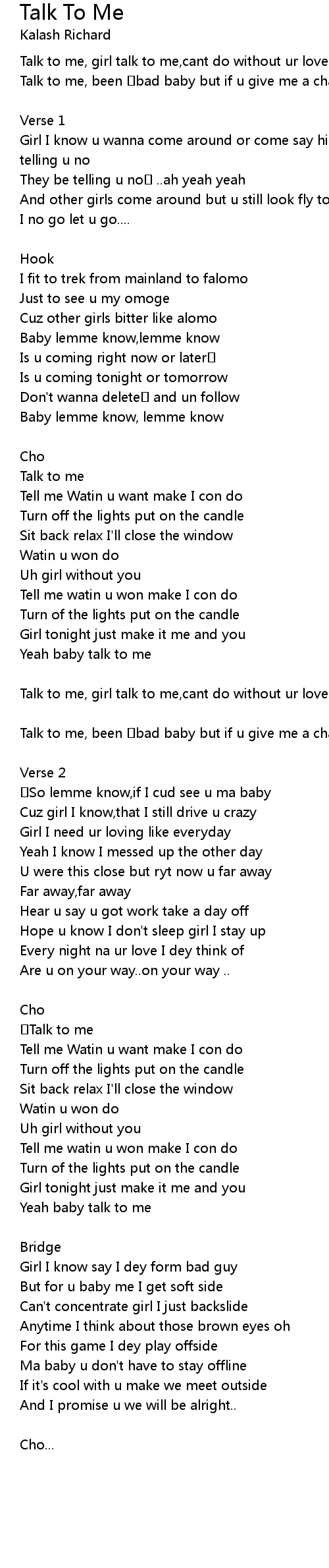 | Talk to me, girl talk to me,cant do without ur love girl talk to me | |