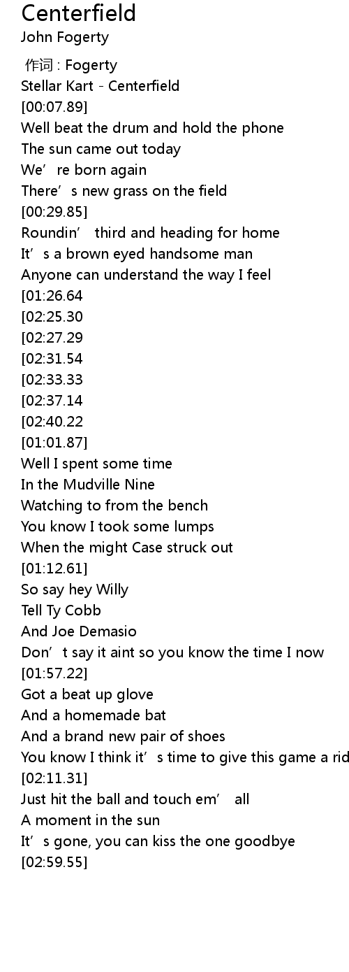 | [02:55.48][02:40.22][01:41.66][00:58.61] | Centerfield |