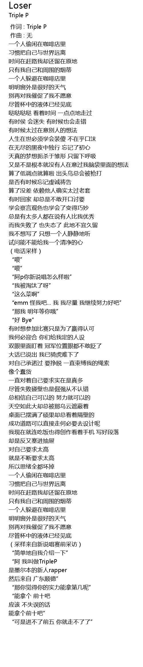 | [01:43.111] | yǒu shí xiǎng cān jiā bǐ sài zhǐ shì wèi le yíng de rèn kě |