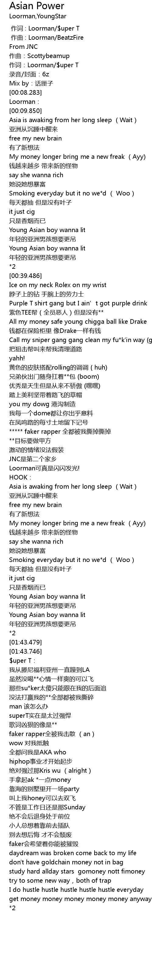 | [00:05.415] | 作词:Loorman/$uper T |