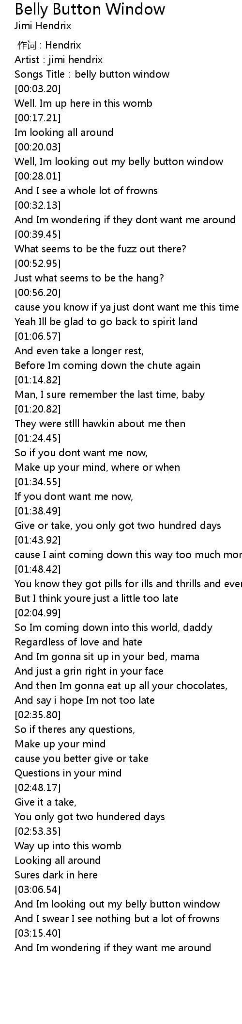 | [00:24.76] | Well, Im looking out my belly button window |