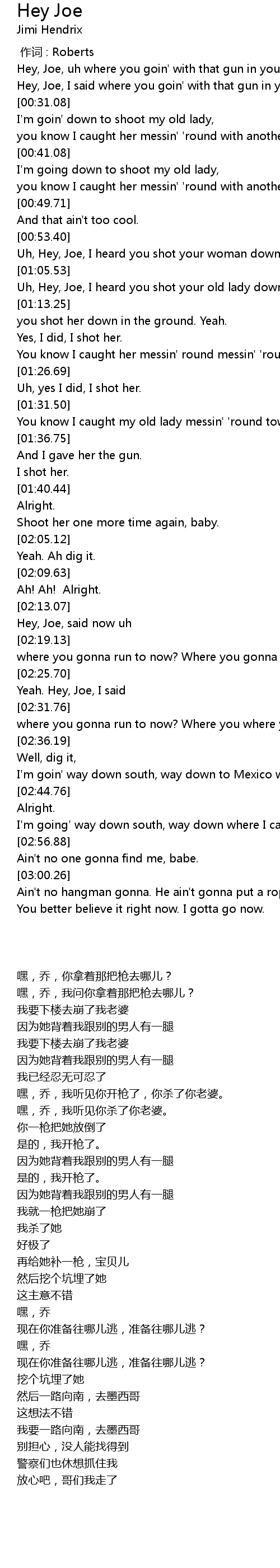 | [00:09.80] | Hey, Joe, uh where you goin' with that gun in your hand? |