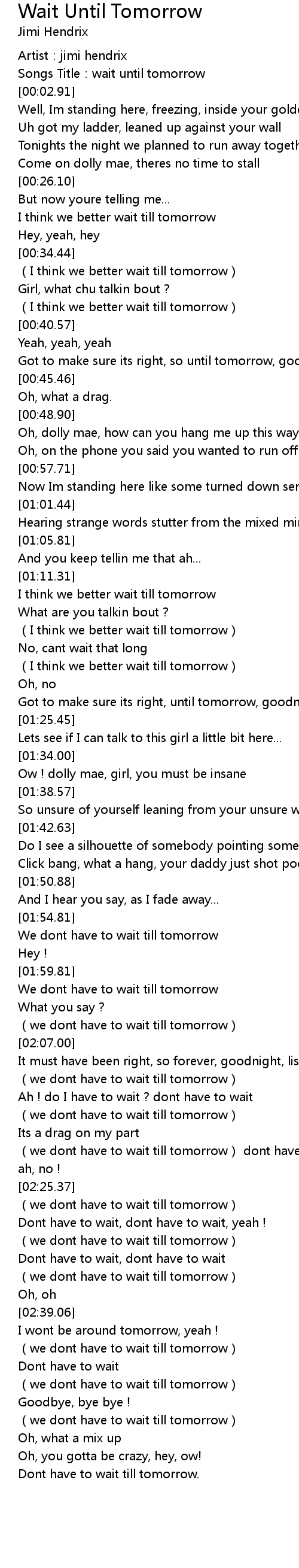 | [02:32.56] | (we dont have to wait till tomorrow) |