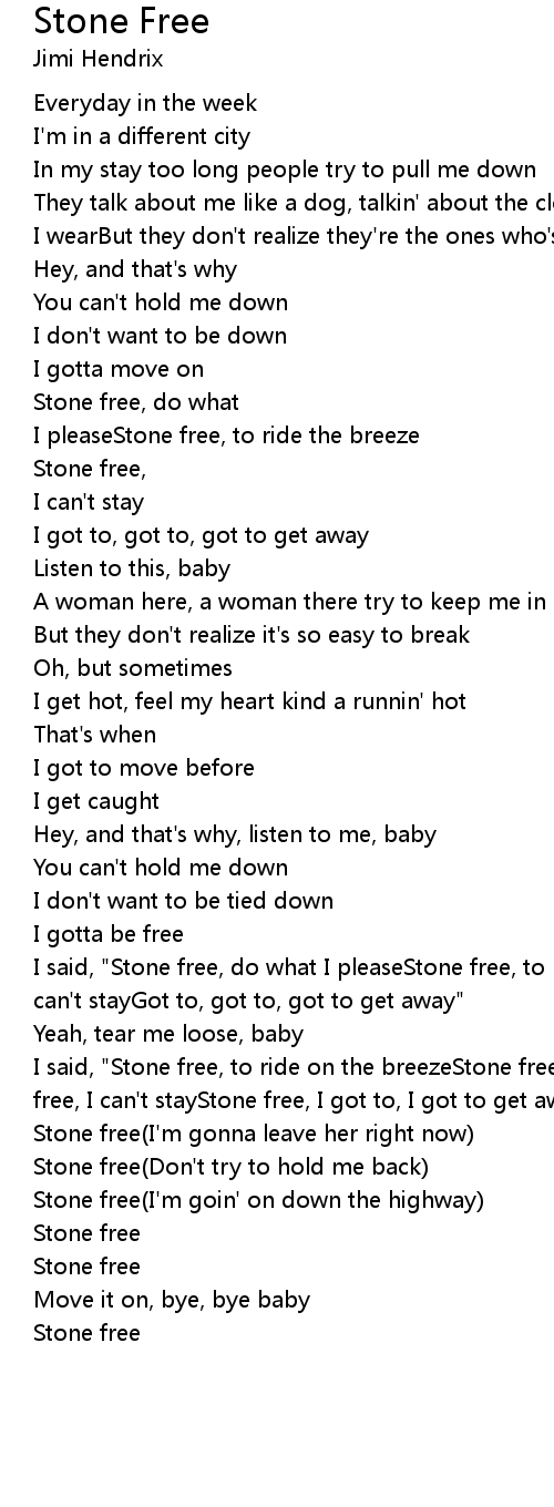 I said, "Stone free, to ride on the breezeStone free, do what I pleaseStone free, I can't stayStone free, I got to, I got to get away" |