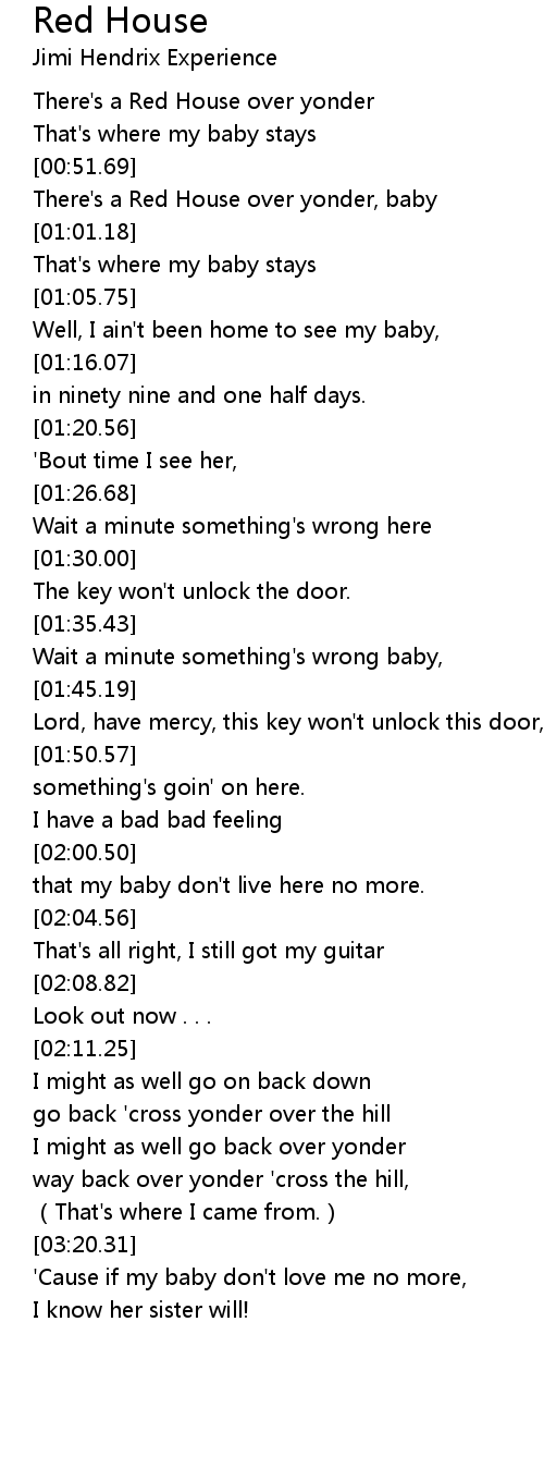 | [00:58.31] | There' s a Red House over yonder, baby |