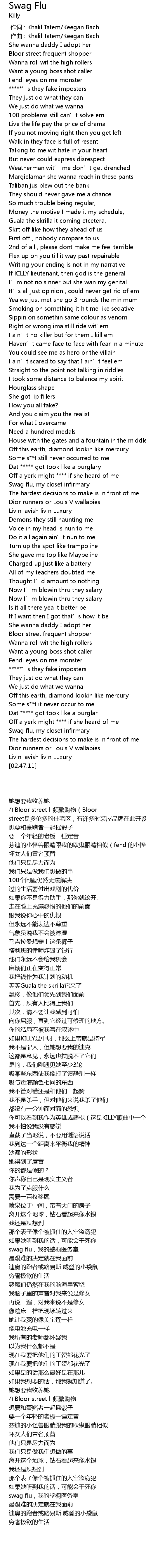 | [02:40.42] | Swag flu, my closet infirmary |