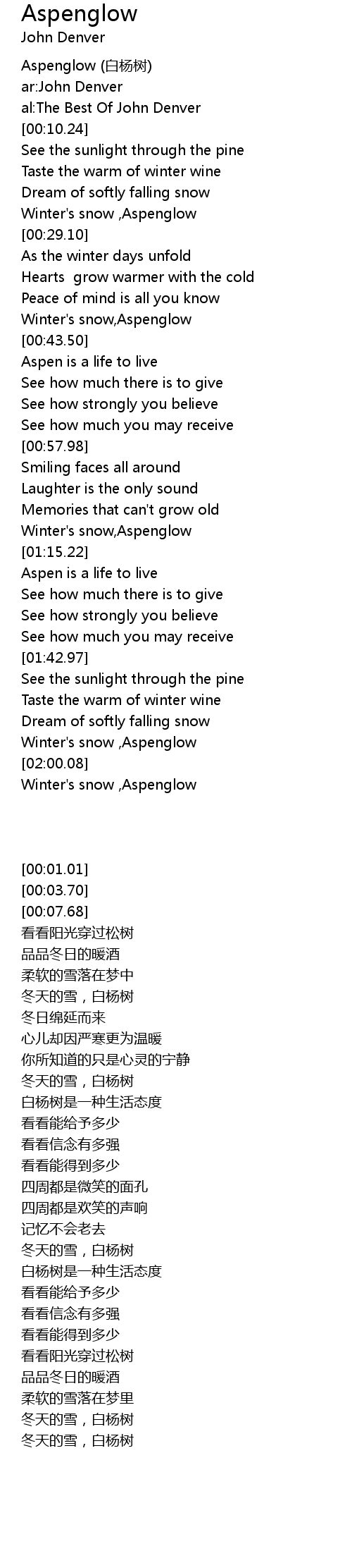 | [00:39.78] | Winter's snow,Aspenglow |