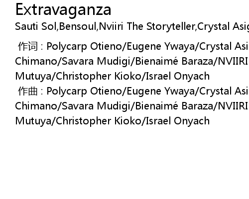 | [00:00.000] | 作词 : Polycarp Otieno/Eugene Ywaya/Crystal Asige/Willis Chimano/Savara Mudigi/Bienaimé Baraza/NVIIRI SANDE/Mutoriah/Benson Mutuya/Christopher Kioko/Israel Onyach |