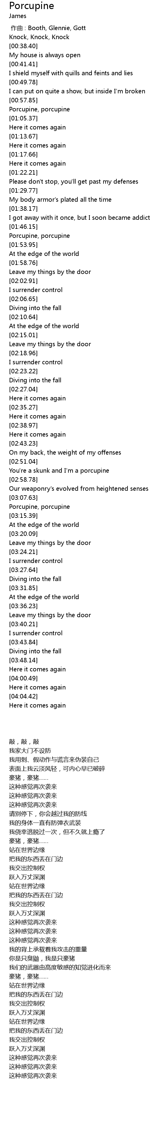 | [01:00.87] | Porcupine, porcupine |