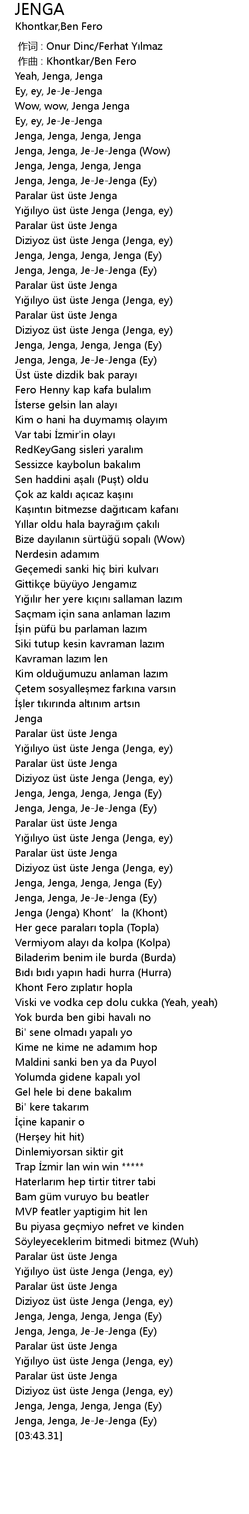 | [03:17.62] | Diziyoz ü st ü ste Jenga Jenga, ey |